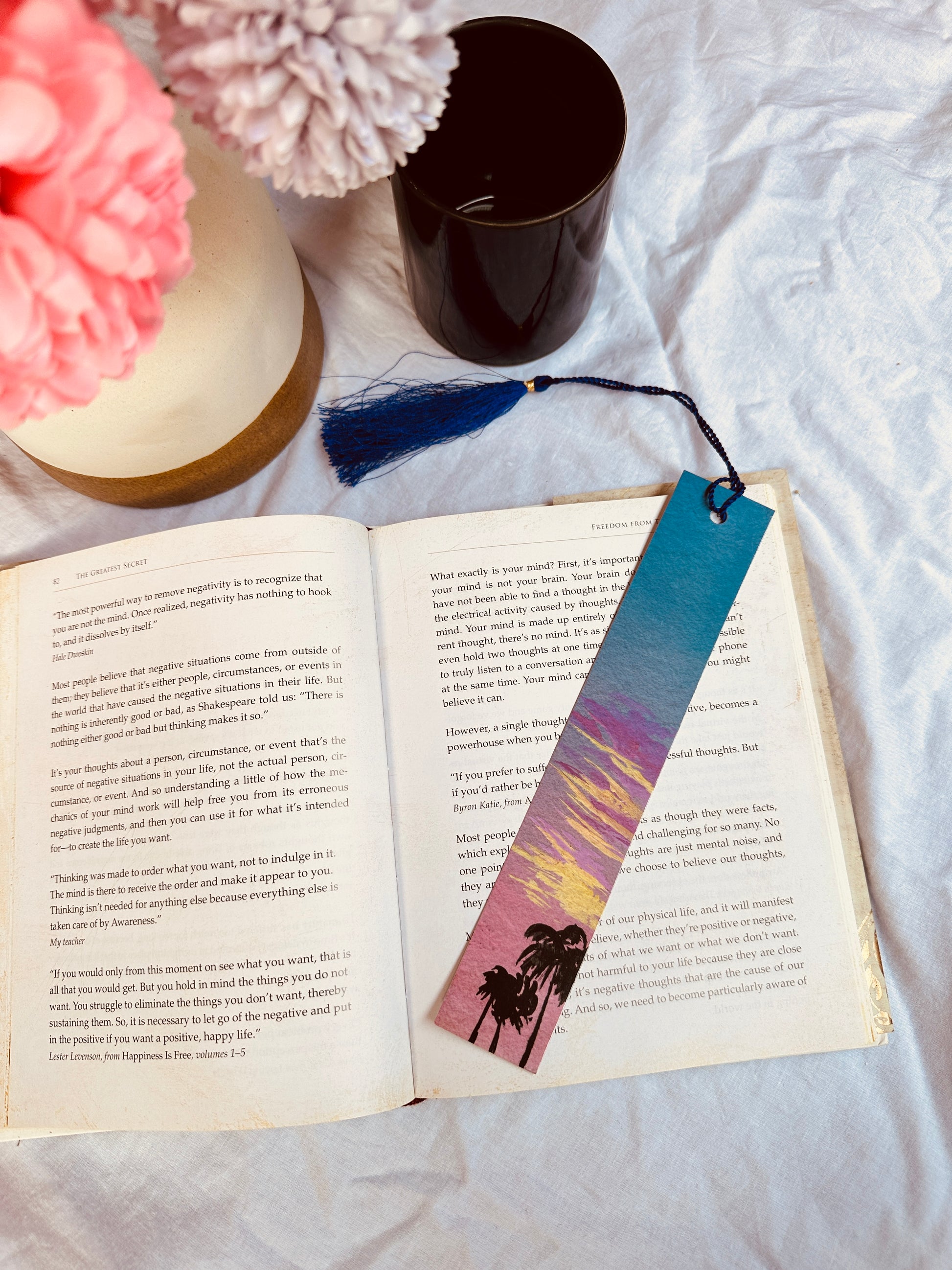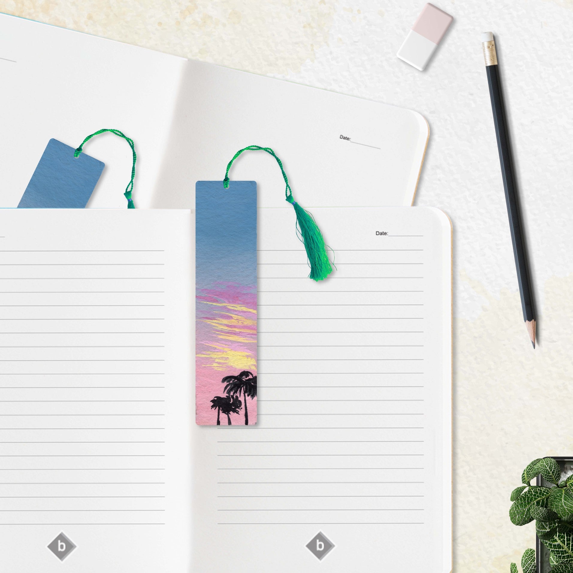 Design: The "Calabasas Sky" Paper Bookmark features a stunning illustration of a tranquil pink and blue sky with graceful palm trees, evoking a sense of peace and wanderlust.